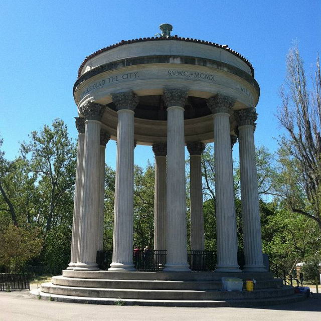 | The Sunol Water Temple is located in Sunol, California. Designed by Willis Polk, the 59 foot high classical pavilion is made up of twelve concrete Corinthian columns and a concrete ring girder that supports the conical wood and tile roof. | |