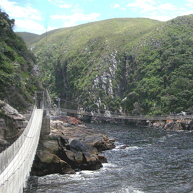 | Hiking Trails: The Suspension Bridge is accessible via a short hike along well-maintained trails. Visitors can embark on the popular Mouth Trail, which takes them through indigenous forests and across the bridge. The trail offers stunning views of the Storms River Gorge and the surrounding natural landscape. Bridge Structure: The Suspension Bridge is a pedestrian bridge that spans the mouth of the Storms River. It is a suspended cable bridge, providing visitors with a unique vantage point to admire the river, its gorge, and the rugged coastline. The bridge is designed to sway slightly as people walk across, adding to the sense of adventure. Adventure Activities: The Storms River Mouth area is known for its adventure activities. Visitors can participate in activities such as kayaking, snorkeling, scuba diving, and bungee jumping from the nearby Bloukrans Bridge, which is one of the world's highest commercial bungee jumping spots. Wildlife and Nature: Tsitsikamma National Park is home to diverse flora and fauna. Along the hiking trails and around the Suspension Bridge, visitors may encounter various bird species, small mammals, and marine life. The park is also known for its unique fynbos vegetation and ancient yellowwood trees. Conservation and Sustainability: Tsitsikamma National Park, including the Storms River Mouth area, is part of the larger Garden Route National Park, which is managed by South African National Parks (SANParks). Efforts are made to preserve the natural beauty and biodiversity of the area, and visitors are encouraged to respect and protect the environment. Visitor Facilities: At Storms River Mouth, there are visitor facilities available, including a restaurant, picnic areas, restrooms, and a small shop. The park entrance fee is required for access, and it is recommended to check the park's operating hours and any visitor restrictions before planning a visit. The Suspension Bridge at Storms River Mouth offers visitors a chance to immerse themselves in the scenic beauty of South Africa's coastline and explore the natural wonders of Tsitsikamma National Park. | |