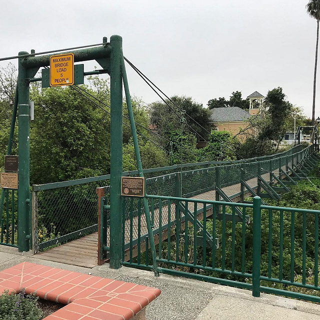 | The Swinging Bridge in Arroyo Grande, California, is a historic landmark that holds a special place in the hearts of local residents and visitors alike. It spans across the Arroyo Grande Creek. Swinging Bridge spans a total length 171 feet and is suspended 40 feet above the creek. | |