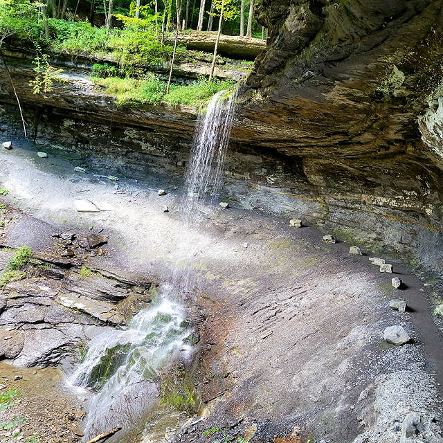 | Amid the undeveloped land of the Labrador Hollow State Preserve, this location offers a peaceful and wondrous environment worthy of becoming a state park and tourist destination. The 80 ft waterfall is divided into a series of drops, the most dramatic being the 50 ft overhanging free-fall. From there, the water divides, winding around large boulders as it makes its way to the bottom. | |