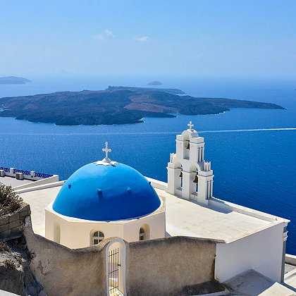| The Church of the Three Bells in Fira on Santorini is one of the most famous, photogenic and most photographed Greek Catholic churches on the island. It is also called the Church of the Ascension of the Blessed Virgin Mary. The church stands in an extremely picturesque location, and its dome and bell tower looking out over the caldera is one of the most photographed objects not only on Santorini, but all over Greece. | |