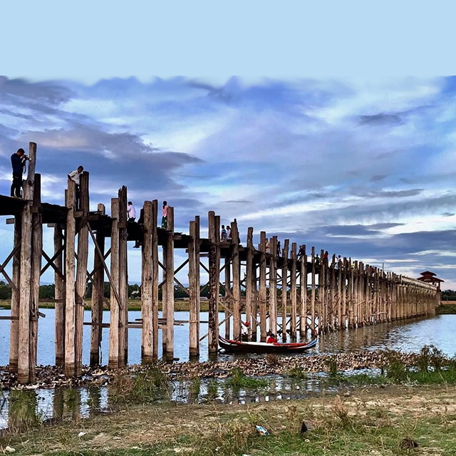 | U Bein Bridge is a crossing that spans the Taungthaman Lake near Amarapura in Myanmar. The 1.2-kilometre (0.75 mi) bridge was built around 1850 and is believed to be the oldest and longest teakwood bridge in the world. It is used as an important passageway for the local people and has also become a tourist attraction and, therefore, a significant source of income for souvenir sellers. | |