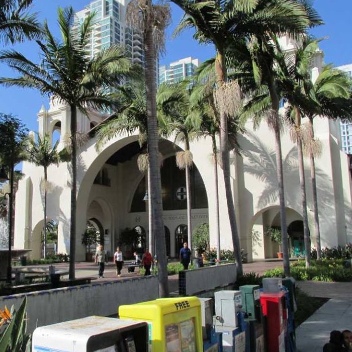 | The magnificent 1915 Santa Fe Depot (Union Station) is a monumental reminder of California's Spanish heritage. The station was designed by San Francisco architects Bakewell & Brown to reflect the colonial Spanish and Mission history of California. | |