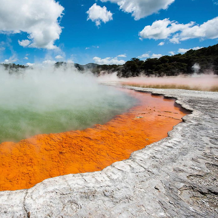 | Geothermal Features: The area is home to numerous geothermal features, including colorful hot springs, steaming fumaroles, bubbling mud pools, and the famous Champagne Pool. These natural wonders are a result of the volcanic activity and the interaction of geothermal water with minerals in the ground. The Champagne Pool: The Champagne Pool is the most iconic feature of Waiotapu. It is a large, deep, hot spring characterized by its vibrant orange and green colors caused by minerals and microorganisms. The pool emits carbon dioxide, which creates effervescent bubbles, resembling a glass of champagne. Lady Knox Geyser: Adjacent to Waiotapu Thermal Wonderland is the Lady Knox Geyser, a natural geyser that erupts daily at a scheduled time. Visitors can witness the eruption, which reaches heights of up to 20 meters (65 feet). Geothermal Walks: Waiotapu offers several well-marked walking trails that allow visitors to explore the geothermal wonders at their own pace. The walks take you through diverse landscapes, including colorful terraces, bubbling mud pools, and steaming vents. The paths are designed to provide both educational information and stunning views of the geothermal features. Visitor Centre and Facilities: Waiotapu Thermal Wonderland has a visitor center that provides information about the geothermal area, its geological processes, and the cultural significance of the site. The center also offers amenities such as restrooms, a gift shop, and a café. Cultural Significance: Waiotapu is located in an area of cultural significance to the local MÄori people. The name "Waiotapu" means "sacred waters" in MÄori, highlighting the importance and reverence for the geothermal features in the region. Visiting Waiotapu Thermal Wonderland offers a unique opportunity to witness the power and beauty of New Zealand's geothermal activity. It's important to follow designated paths and respect any safety instructions provided by the park authorities to ensure a safe and enjoyable experience. | |