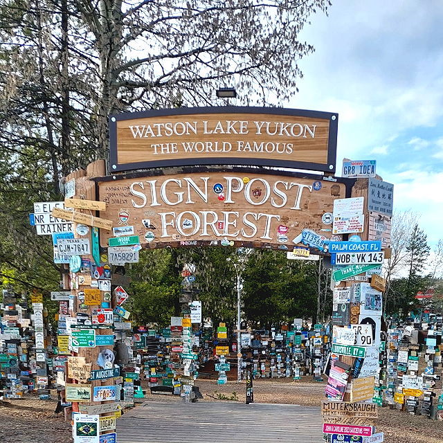 | Watson Lake’s most recognizable landmark is unique, endearing and a little bit wacky—in a good way. A simple act by a homesick American soldier in 1942 began what would become the Sign Post Forest. While building the Alaska Highway, the soldier posted a sign pointing in the direction of his hometown more than 4,300 kilometres away. Visitors from around the world have since posted their own signs, creating a one-of-a-kind attraction. | |