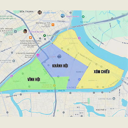 | Xom Chieu Ward is located in the center of Ho Chi Minh City, with geographical location: - The East borders An Khanh Ward with the boundary being the Saigon River. - The West borders Khanh Hoi Ward with the boundary being Doan Van Bo Street and Xom Chieu. - The South borders Tan Hung Ward and Tan Thuan Ward with the boundary being Kenh Te. - The North borders Sai Gon Ward and Ben Thanh Ward with the boundary being Kenh Ben Nghe. | |