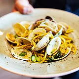 S.Y. Kitchen has four main dining areas, and ample outdoor seating options: the Front Room (bar); the Porch (always hopping); the intimate Dining Room; and the recently-refreshed rear Courtyard, as well as a sweet alcove with a cozy sofa and beautiful fire pit for guests waiting for tables, or simply wanting to sip a glass of wine while the sun sets.