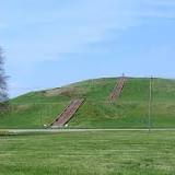 Cahokia Mounds preserves 70 of the original 120 earthen mounds built by pre-historic Native Americans. Visitors may climb a stairway to the top of Monks Mound, where interpretive signs provide an explanation of the impressive view.