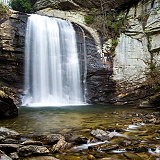 Looking Glass Falls is a waterfall in Western North Carolina, located near Brevard. It is perhaps the best known waterfall in the area. It's about 60' high and swimming is allowed in the pool at the base. The water is always cold.