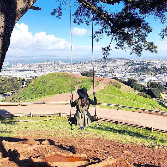 | Bernal Heights Park is one of the best places to enjoy 360-degree panorama views of San Francisco sights — including the Golden Gate Bridge, downtown, San Bruno Mountain, and gorgeous hills in the distance. There are many attractions and activities at the park, including an off-leash dog play area and the annual San Francisco Illegal Soapbox Society’s derby. | |