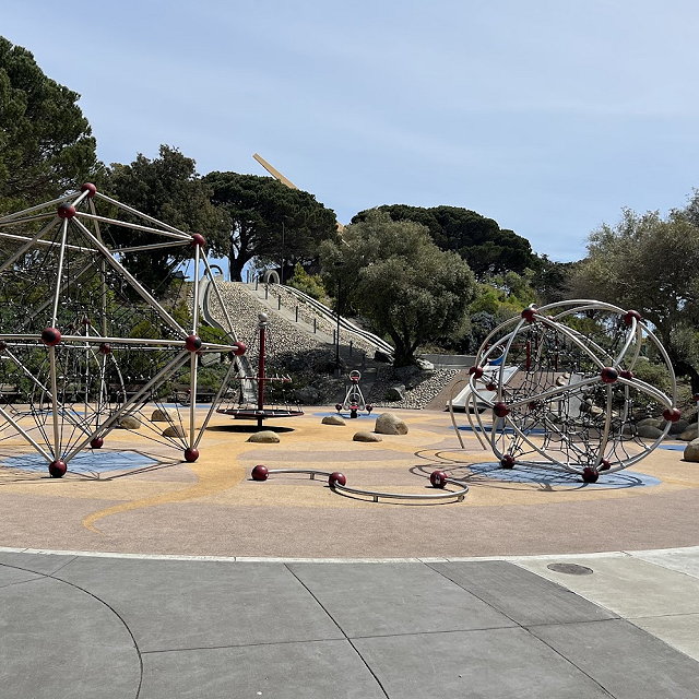 | The park now features a colorful celestial theme on its playground equipment, a 'Dish' funded in part by the Tony Hawk Foundation, telescopes for viewing the cityscape, an adult exercise area, increased picnic and barbecue facilities, and sustainable features such as native plantings, natural irrigation and stormwater retention. | |