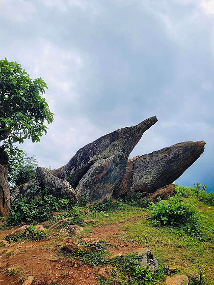 | Mỏm Cá Heo is a distinctive natural rock formation located in Tà Xùa commune, Bắc Yên district, Sơn La province, Vietnam. It features two large rock slabs resembling the shape of a dolphin's head swimming amidst a sea of clouds. The rocks are covered in patches of moss, creating a wild and pristine beauty that harmonizes with the majestic surrounding landscape of Tà Xùa. | |