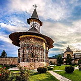 High walls and sturdy defensive towers surround the vast Sucevita monastery complex, giving it the appearance of a fortress. An elegant minaret rests on a star-shaped pedestal atop the church. A massive portico protects the exterior frescoes, painted by local artists between 1602 and 1604.