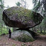 Kummakivi is a large balancing rock in Ruokolahti, Finland. The length of Kummakivi is about 23 feet (or 7 meters). It is supported by the minute, precipitously sloping imprint of a smaller rock outcrop that rises from the ground of the forest. The rock in question looks to be on the verge of falling off its ledge, yet it is impossible to move it, at least not with the strength of human muscles.