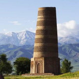 The Burana Tower is a large minaret in the Chuy Valley in northern Kyrgyzstan. The tower, along with grave markers, some earthworks and the remnants of a castle and three mausoleums, is all that remains of the ancient city of Balasagun, which was established by the Karakhanids at the end of the 9th century.
