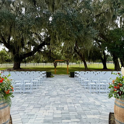 Located less than a mile from the small town of Callahan, Plantation Oaks Farms is a beautiful wedding venue nestled between the countryside and a horse farm, capable of accommodating small groups as well as large gatherings. The air-conditioned event shed can accommodate up to 300 guests. All the event packages include tables, chairs, and tablecloths. There is a bridal cabin and a groom's room.