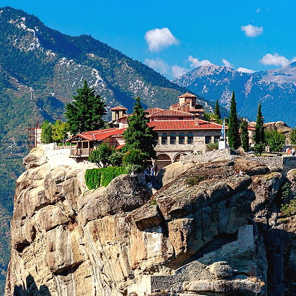 Greece » Thessaly Perched on a nearly vertical cliff, the Holy Trinity Monastery is perhaps Meteora's most impressive sanctuary, often appearing to float in mid-air. Historically, access to the monastery was via a rope basket, followed by a climb of 140 carved steps. The monastery gained worldwide fame after its appearance in the James Bond film "For Your Eyes Only". |