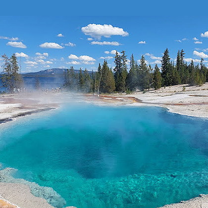 Wyoming » WY Yellowstone Lake is the largest mountain lake in the United States. It is approximately 20 miles long and 14 miles wide. Located at an elevation of 7,732 feet (2,357 m) above sea level, the lake covers an area of 136 square miles (350 km²) with a shoreline of 110 miles (180 km). The northern shore is easily accessible, and nearby activities include boating, hiking, fishing, camping, and recreation. |