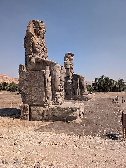 Egypt » Luxor The Temple of the Sun of Amenhotep III is located on the west bank of the Nile River, opposite the city of Luxor on the east bank. Standing 17 meters tall and weighing over 700 tons each, these two statues of Amenhotep III are known as the Memnon Colossus, but it is believed they were once part of the Pharaoh's lost funerary temple. |