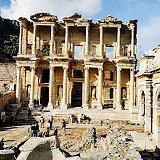 The Celsus Library is an ancient Roman architectural structure in Ephesus, Anatolia, located near the modern town of Selçuk, in the İzmir province of western Türkiye. The library has a two-story facade, and inside is a large room measuring between 10.90 and 16.70 meters. This library room sits on a vaulted foundation. The structure is surrounded by an additional wall, which helps protect it from moisture.
