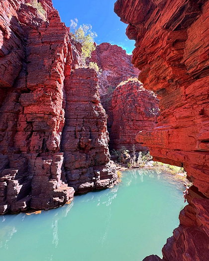 | Located 1,500km north of Perth and around 80km north-east of Tom Price, Karijini National Park is the second largest national park in Western Australia covering 627,422 hectares and is ranked in the top 5 visitor experiences for the state. Karijini is famous for its spectacular gorges and slot canyons, towering sheer sided chasms up to 100 metres deep, dramatic waterfalls, rocky creeks, refreshing waterholes and colours ranging from pindan red-orange to deep blue-purple rocks and jade green water. | |