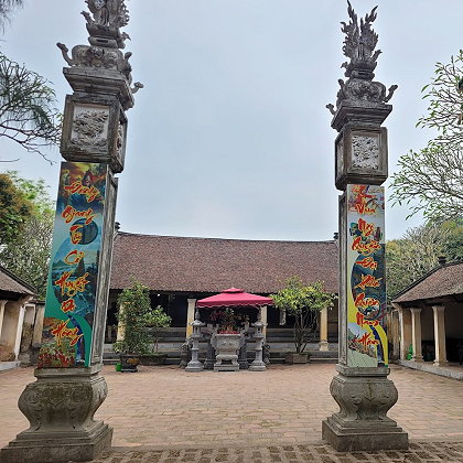 | The complex is situated on Cam Hill, with the temple at the top and the mausoleum about 100 meters below. It is part of the larger Đường Lâm Ancient Village, which is known as "the land of the two kings" because it was also the hometown of another Vietnamese hero, Phùng Hưng. Ngô Quyền was born in Đường Lâm and led a successful resistance war against the Southern Han army in 938 AD, famously employing a tactic of planting sharpened wooden stakes in the Bạch Đằng River to defeat the invading navy. The site serves as a place to honor Ngô Quyền and his contributions to Vietnamese independence. The temple and mausoleum are built in a traditional Vietnamese architectural style. The temple has a relatively modest scale, with an entrance gate, side buildings, and a main worship hall. The complex is set against a backdrop of peaceful countryside, with a large field and a river in front of it. The complex is a popular destination for those interested in Vietnamese history and culture. The local people hold an annual memorial ceremony for Ngô Quyền on the 14th day of the second lunar month. | |