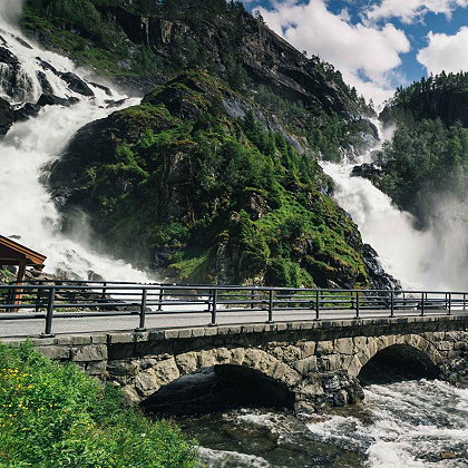 | Låtefossen is the main attraction in Oddadalen, also known as "the Valley of Waterfalls". The Låtefossen twin waterfalls were a popular tourist attraction as early as during the 19th century. The 165 m drop waterfall is easily accessible by route 13. Water from the waterfall showers the road before it runs underneath the old stone bridge. It then runs into the Opo river meandering through Oddadalen, which has seven waterfalls over a distance of 10 km. | |