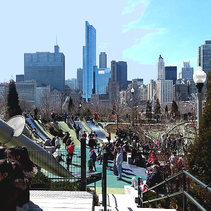 | Maggie Daley Park is a 20-acre (81,000 m2) public park located in Chicago's Loop community area. Maggie Daley Park connects to Millennium Park via the BP Pedestrian Bridge. Maggie Daley is a magnificent recreation center with a children's playground, a climbing wall, miniature golf, picnic areas, a roller skating rink, tennis courts, and a formal garden. | |