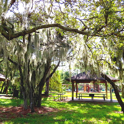 | Rotary Park is a 10-acre community river park situated on the shores of the Indian River Lagoon. A popular site for group and community gatherings is the park’s large pavilion, which seats up to 150 and includes restrooms, two barbecue pits and an expansive river view. Nearby is a large colorful playground system with toddler equipment, and along the shore and boardwalk are three sheltered family picnic tables. | |
