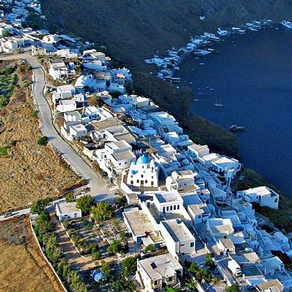 | Its main settlement, Manolas Village, sits perched on a hill with captivating views from its caldera. Therasia retains a more traditional, slow-paced charm. Whitewashed houses, narrow cobbled paths, and colorful churches dot the island, giving visitors a feel of authentic Cycladic architecture. The village’s hilltop location offers panoramic views from the caldera to Santorini's famous sunset, without the crowds. | |