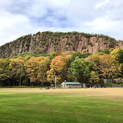 | West Rock Park spans over 1,700 acres along the basalt slopes of West Rock, rising more than 700 feet above the surrounding landscape. The park's seven-mile (11 km) westward-facing cliffs offer sweeping views of the entire New Haven metropolitan area and surrounding towns to the west. | |